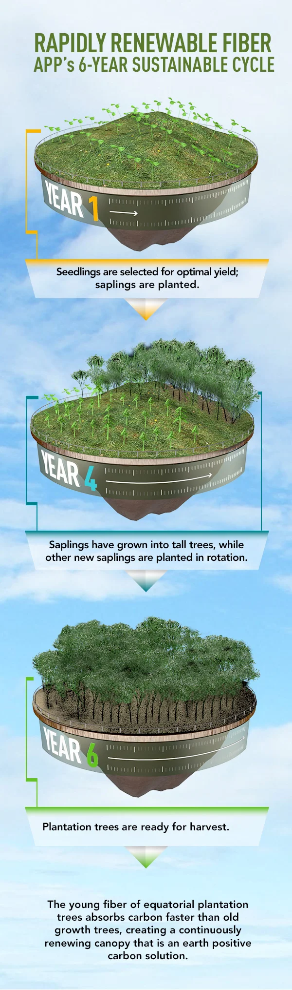 This infographic illustrates the 6 year cycle of tree plantation in Indonesia that allows APP to sustainably produce paper products efficiently. I designed this and used 3D to create the saplings, trees and floating island objects.