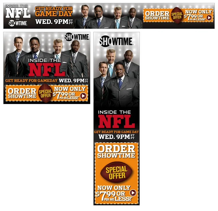 This is an ad campaign for Showtime's series Inside the NFL. These end frames are representative of a lot of similar projects. I designed and art directed the production of these animated banners.